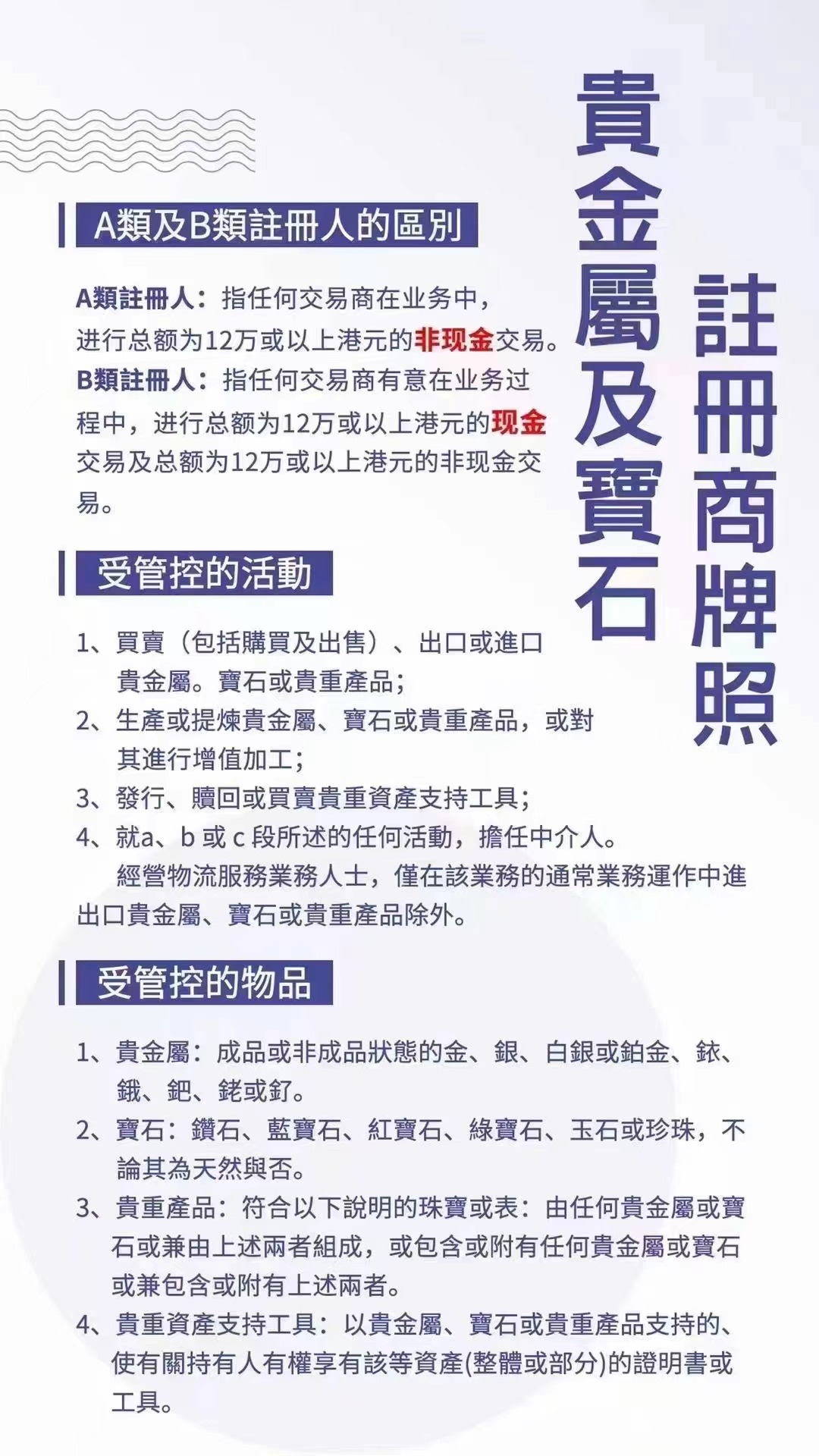 在香港,根据《反洗黑钱及反恐融资条例》(AMLO),贵金属及宝石交易商的注册分为 A类 和 B类。这两类注册主要取决于交易商的业务性质及交易方式。以下是关于 A 类和 B 类的详细介绍: