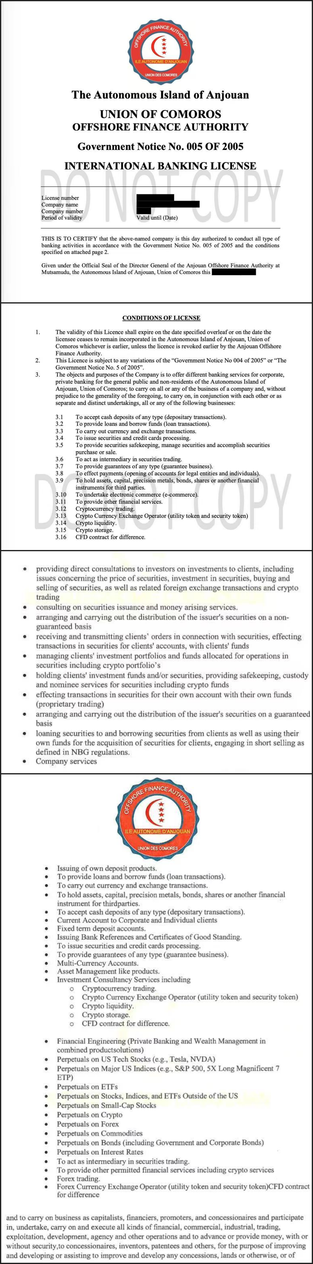 | 颁发机构 Issuing Authority | 昂儒昂离岸金融管理局 Anjouan Offshore Finance Authority |